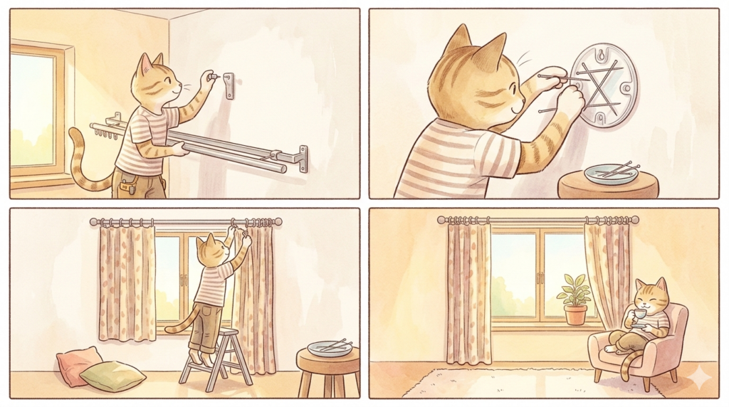 - 賃貸向けDIY: 壁を傷つけずにカーテンレールを増設したり、ブラインドを設置するテクニック。