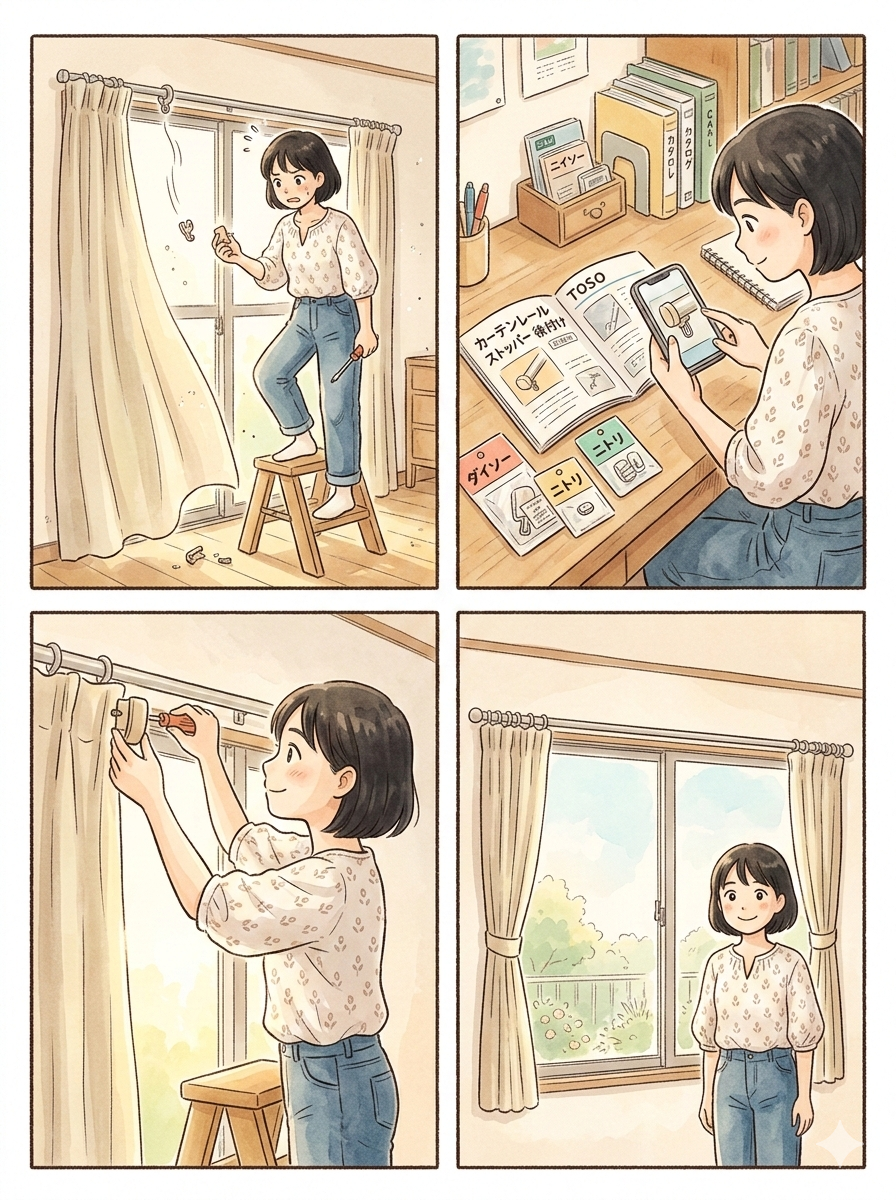 100均のストッパーを後付けするなら、重量の軽いレースカーテン用や、あまり開閉しない小窓などに使うのが賢い方法です。逆に、毎日激しく開閉するリビングの厚地カーテンなどは、負荷がかかりやすいため、後述するメーカー純正品を選んだ方が、結果的に長く安心して使い続けられるでしょう。用途とコストのバランスを考えて選んでみてくださいね。