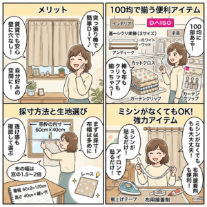 「DIYに興味はあるけど、ミシンや針仕事は苦手」という方こそ、100均アイテムをフル活用しましょう。最近の100円ショップには、アイロンで接着できる裾上げテープだけでなく、布用の超強力両面テープやボンドも充実しています。布を窓のサイズに合わせて切り、端を折り返してテープで留めるだけで、ほつれのない綺麗なカーテンが出来上がります。突っ張り棒を通すための穴(袋状にする部分)も、ボンドで接着してしまえばOK。ミシンを出す手間も場所も取らず、テレビを見ながらでも作れる手軽さが魅力です。この「頑張りすぎないDIY」こそが、長く続けるコツかもしれませんね。