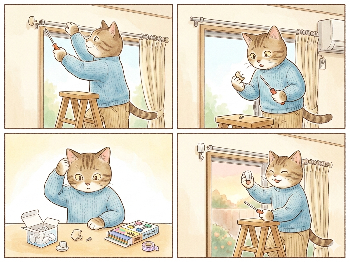 さて、長々とお話ししてきましたが、カーテンレールのエンドキャップという小さな部品ひとつにも、これだけのドラマとテクニックがあるんです。外し方の基本は「構造を知り、正しい道具で、慌てずに対処すること」。そして代用する際は「機能(ストッパー)を満たしつつ、住まいの条件(賃貸か持ち家か)に合わせること」が大切です。