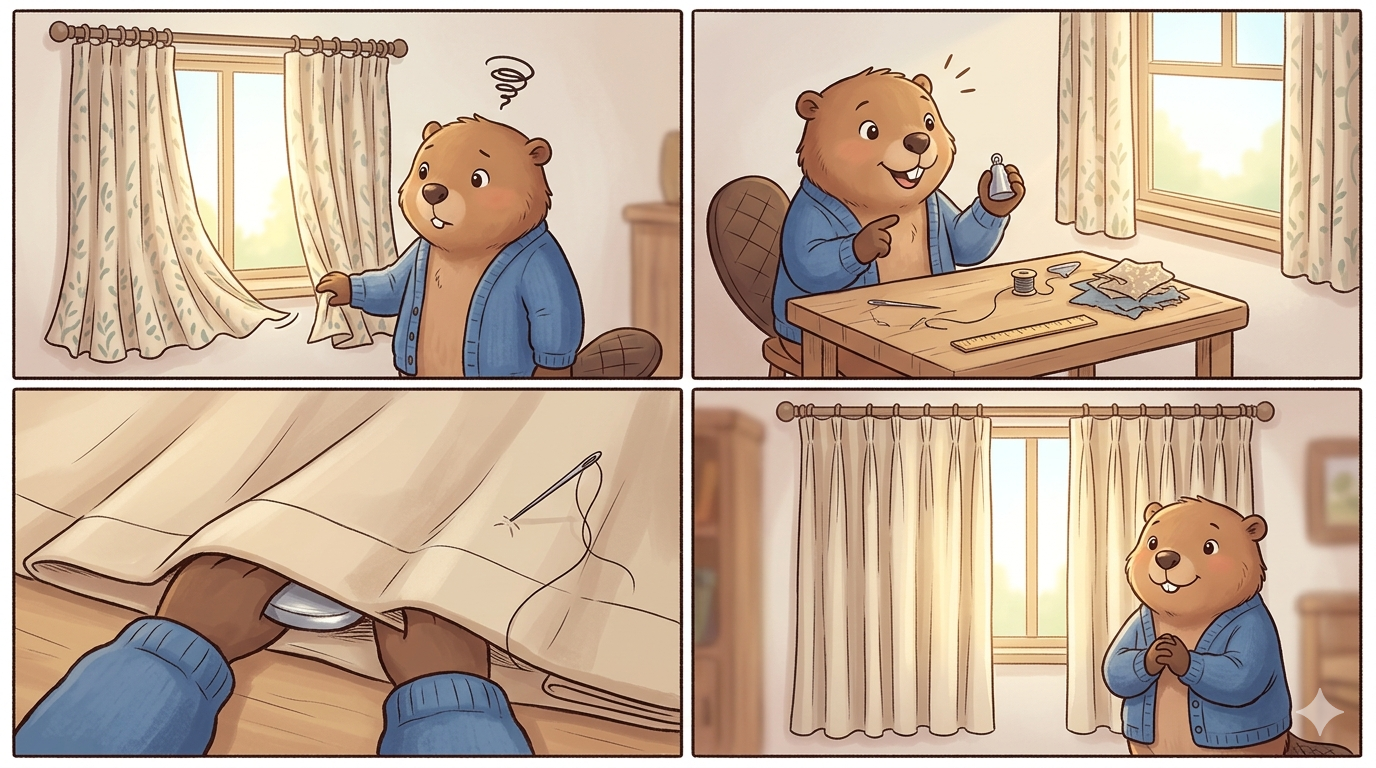 最初はゆっくりで大丈夫。一気に縫おうとせず、10cm〜20cm縫うごとに止まって生地を整える。この繰り返しが、美しい裾ラインを作る秘訣です。自分で縫ったカーテンの裾に、ウェイトの重みがしっかり乗ってきれいなウェーブを描いた瞬間は、何物にも代えがたい達成感がありますよ。ぜひ、焦らず一歩ずつ進めてみてください。