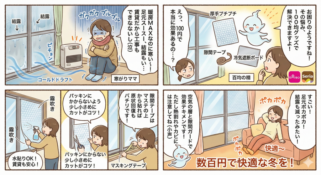 窓の寒さ対策は100均で効果ある?最強グッズと貼り方をマンガで解説
