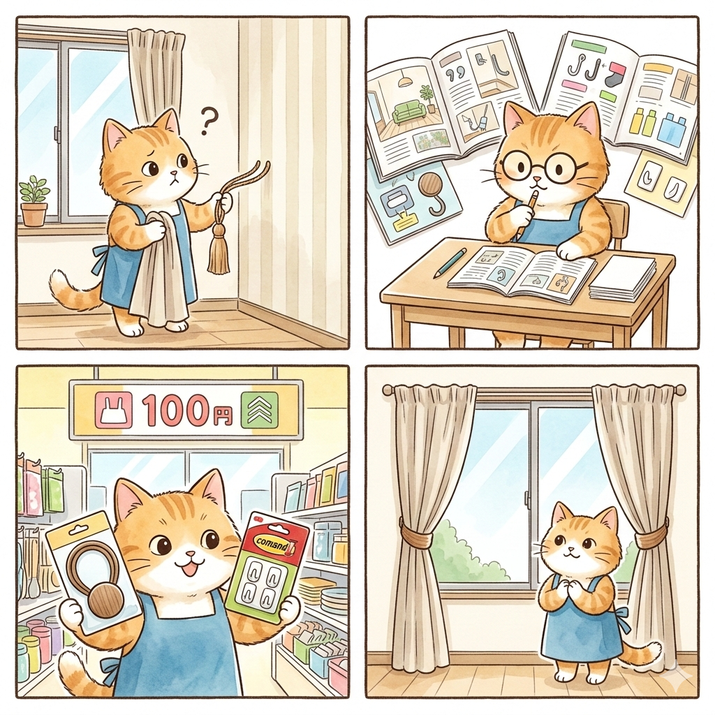 さて、ここまで「カーテンのタッセル用フックがない」という状況を解決するための様々な戦略を見てきましたが、いかがでしたでしょうか。当初は「壁に穴が開けられない不便な状況」だと思っていたかもしれませんが、実は工夫次第で、固定式のフックを使うよりもずっと自由で、おしゃれで、安心感のある窓辺が作れることがお分かりいただけたかと思います。