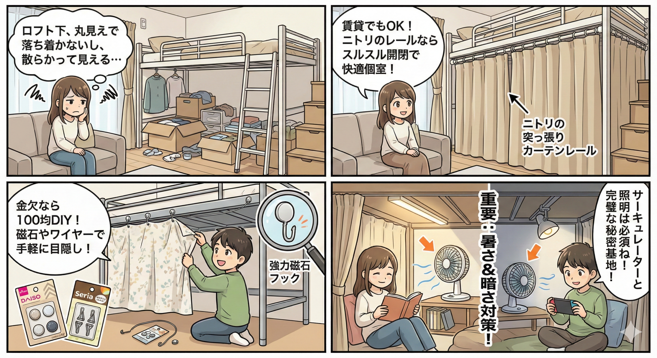 しっかりした個室機能とスムーズな開閉を求めるならニトリの突っ張りカーテンレール、まずは手軽に低予算で試してみたいなら100均のワイヤーや磁石フックなど、ご自身の予算と目的に合わせて最適な方法を選んでみてください。ただし、設置する際は、熱中症を防ぐための「暑さ対策(サーキュレーターの配置)」と、視力を守るための「適切な照明(LEDライト)」の準備もお忘れなく。この記事を参考に、ぜひあなただけの快適で素敵なロフト下空間を作り上げてくださいね。